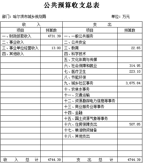 哈尔滨市城乡规划局2016年公共预算收入4744.39万元,其中市财政拨款4731.39万元,事业单位经营收入13万元。