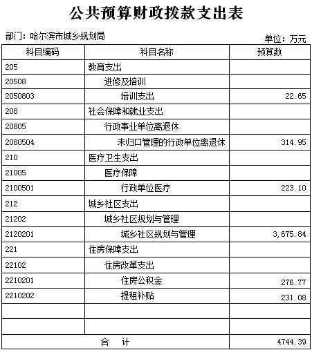 哈尔滨市城乡规划局2016年公共预算拨款支出4744.39万元,其中:教育22.65万元,占总支出的0.48%;社会保障和就业314.95万元,占总支出的6.64%;医疗卫生223.10万元,占总支出的4.70%;城乡社区事务3675.84万元,占总支出的77.48%;住房保障支出507.85万元,占总支出的10.70%。